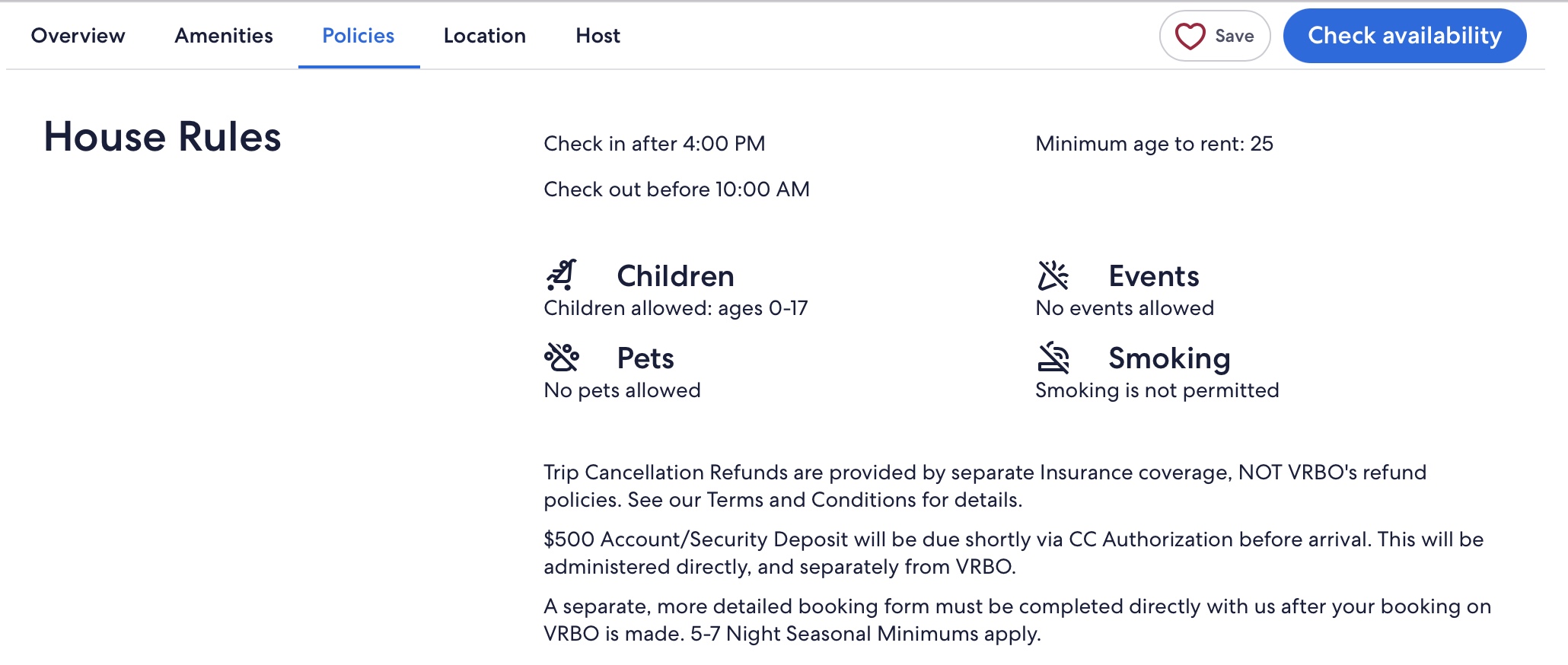 Yes. It wouldn’t be fair to not be upfront about it. It’s explained under the Policies tab on the listing, but sometimes it’s not easy to find. VRBO is constantly making changes to their site, including sometimes hiding things behind tabs you have to click on or you won’t see details. Of course, we have no control over that, and it’s sometimes frustrating for us and our guests. Here’s a screenshot (current at time of writing, but it’s always in the listing somewhere) of it in case you missed it: